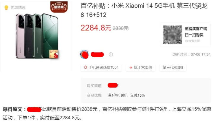 根据张大妈爆料,小米14的16G+512G版本在PDD的百亿补贴活动价是2839元,再加上店铺9折券和国补15%满减,最终实付2284.8元。虽然爆料明确写明只限上海地区,但我用自己账号试了一下,发现也OK。