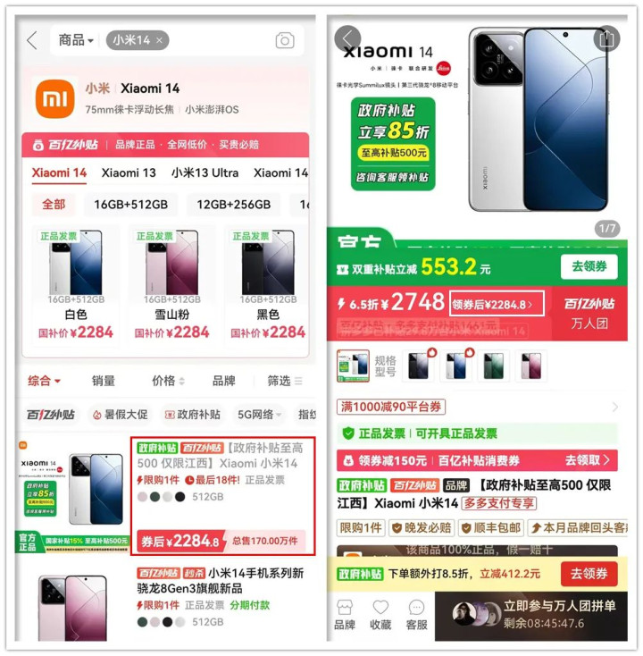 根据我自己在PDD百亿补贴专区搜小米14的结果,同样可以通过多重优惠做到2284.8元,但链接标题又写了“仅限江西”。我凭经验判断,这是平台针对不同地区的定向优惠,确实有限制区域,但应该不止上海或江西这两个区域,大家可以自行测试。