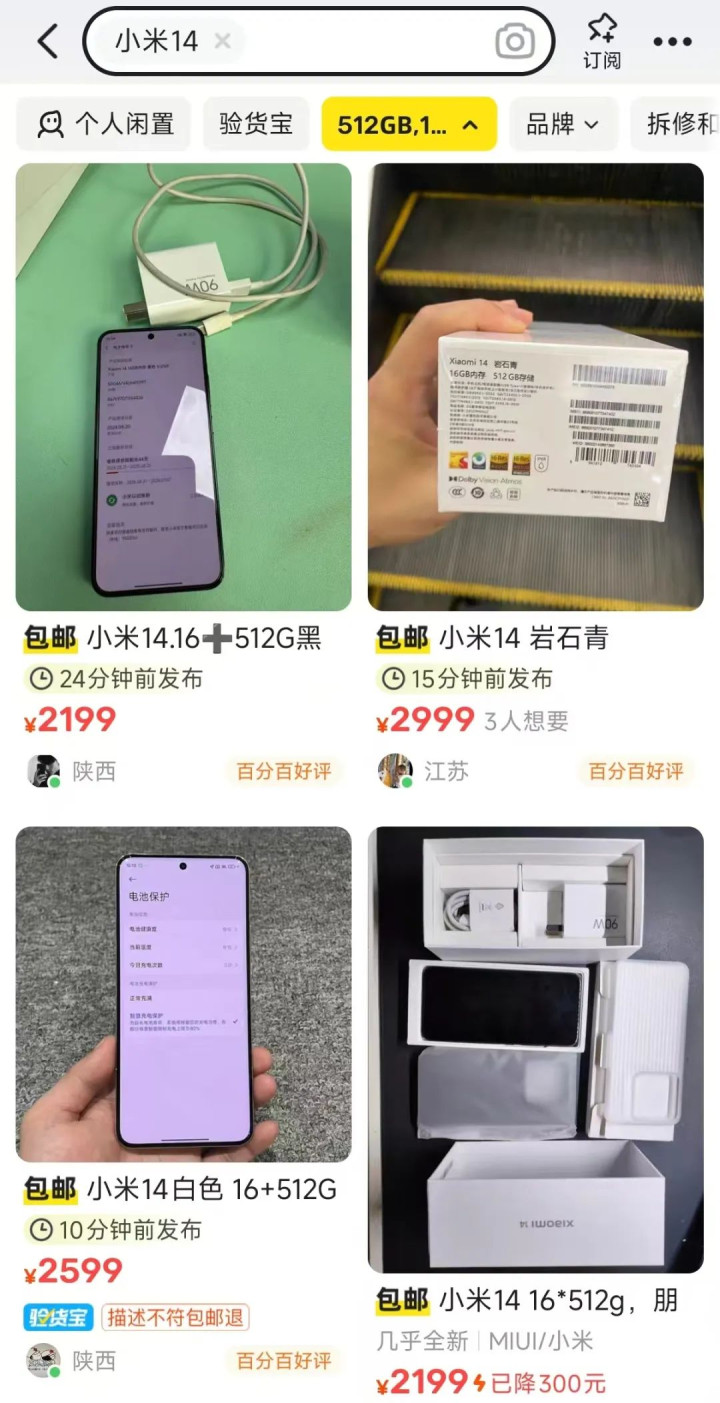 我又去闲鱼瞅了一眼二手价,目前在保的全套小米14(16G+512G)均价在2200元左右,跟国补后的全新价格相差无几,成色较差的过保单机(16G+512G)也要1900元左右。